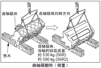 將三菱發(fā)動(dòng)機曲軸箱放置在回轉臺上翻轉。不使用回轉臺時(shí),在曲軸箱上掛上鋼絲索,在鋼絲索和曲軸箱體之間填入墊木或布,用起吊機吊起,然后橫倒放置在枕木上。重新掛鋼絲索,在枕木上將曲軸箱體翻轉( 倒置)。