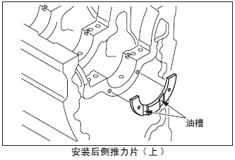 (1) 后側推力片( 上)的油槽面朝發(fā)動(dòng)機后側,對準曲軸箱最后端的定位銷(xiāo)位置后安裝。