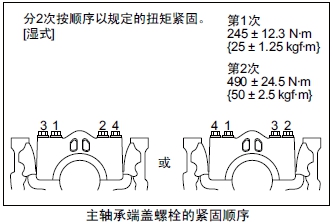 (6) 除曲軸最后端部以外的主軸承端蓋螺栓按照圖示順序,按照規定扭矩緊固。
