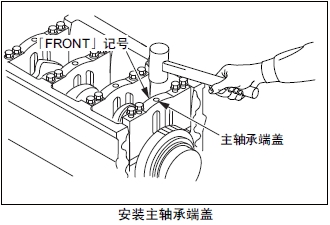 (2) 安裝時(shí),主軸承端蓋上的刻印編號按發(fā)動(dòng)機前側向后側的順序,另外,端蓋「FRONT」記號浮刻的側面朝向發(fā)動(dòng)機前側的方向( 嵌槽都在同側)。