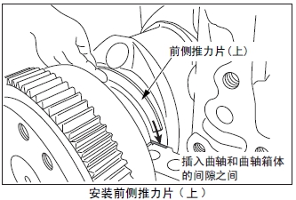 (2) 前側推力片( 上)的油槽面朝發(fā)動(dòng)機的前側,在曲軸和曲軸箱的空隙之間插入前側推力片( 上)。