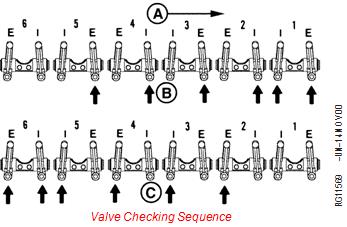 規格搖臂蓋到托架蓋螺釘扭矩……8牛•米(5.9磅-英尺)閥門(mén)檢查順序A-強鹿約翰迪爾柴油發(fā)動(dòng)機前部B-編號。1缸“TDC”C-No。6缸“TDC”強鹿約翰迪爾柴油發(fā)動(dòng)機D-前部